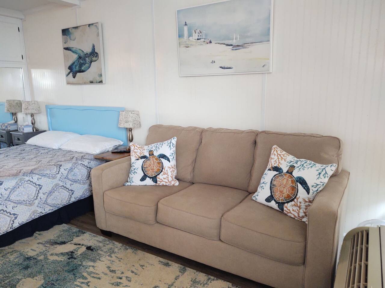 Come enjoy our studio condo haven by the sea! Well appointed kitchen and a full bath, including a bath tub perfect for soaking after a long day on the beach or to easily bathe the children. No stairs in! Very comfortable queen-size bed plus a pull-out, full-size sofa bed for additional sleeping space. While it can accommodate up to four people, the condo may be a bit tight for four adults. A maximum of three adults is recommended. Two adults with two children is also OK for this space. The absolute maximum number allowed is four people, including infants. Coffee, teas, linens, towels, and beach towels provided for your convenience. The exterior of the building is original construction, and we recently made some updates inside including new floors. You can relax with cable TV along with an easy beach side life. Great place to stay for that quiet vacation getaway to the coast! Bring your own hot spot for internet access. While this unit does not have any ocean view, you are mere steps away! This particular unit is also super close to the pool. We ask guests to leave no trace - pick up after themselves and straighten up prior to departure. The cleaning fee is for deep cleaning, sanitizing, and laundering the linens between guests to make the unit as safe as possible for every stay. Notes: We welcome nice, responsible humans of all races, ethnicities, origins, genders, orientations, and religions! This home is in Eastern North Carolina, near the water. While we have regular pest control visits, you may still encounter a bug or two. The home is professionally cleaned between every guest and bugs just sometimes appear in this region.