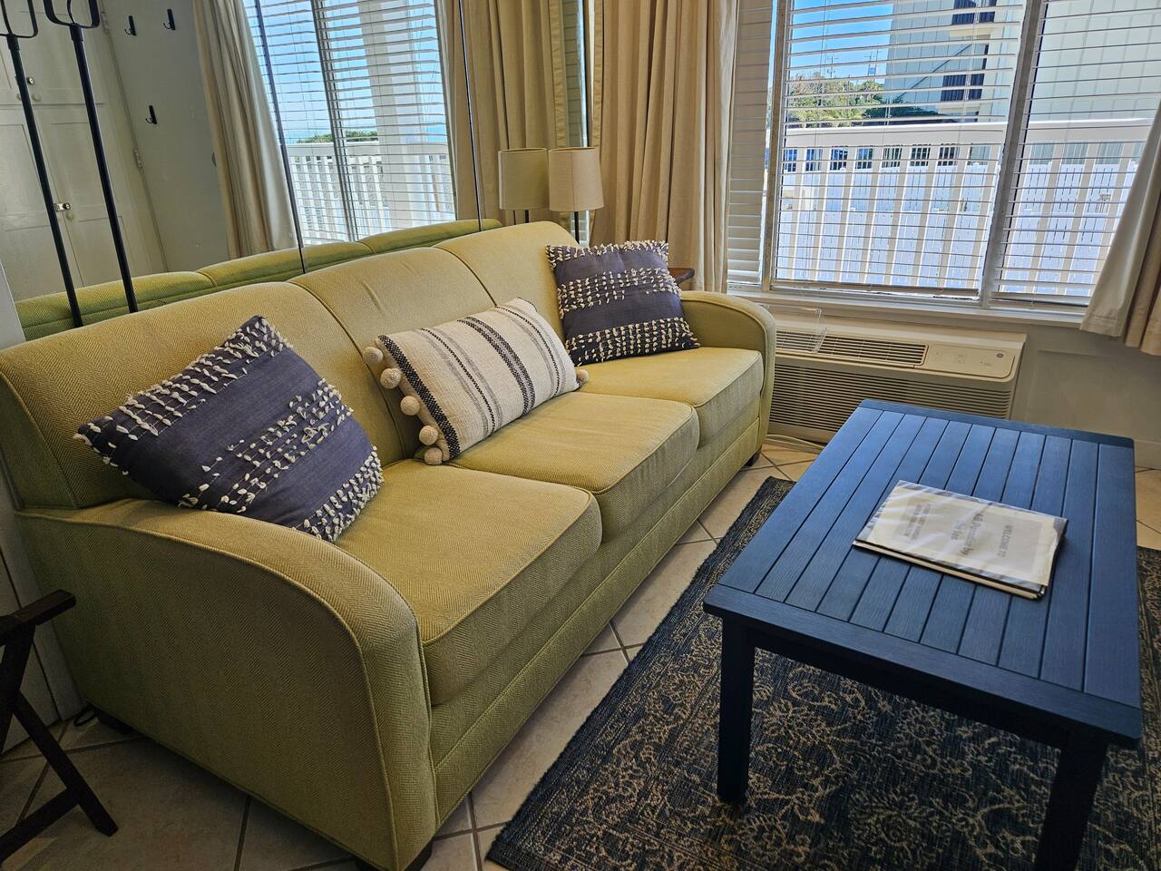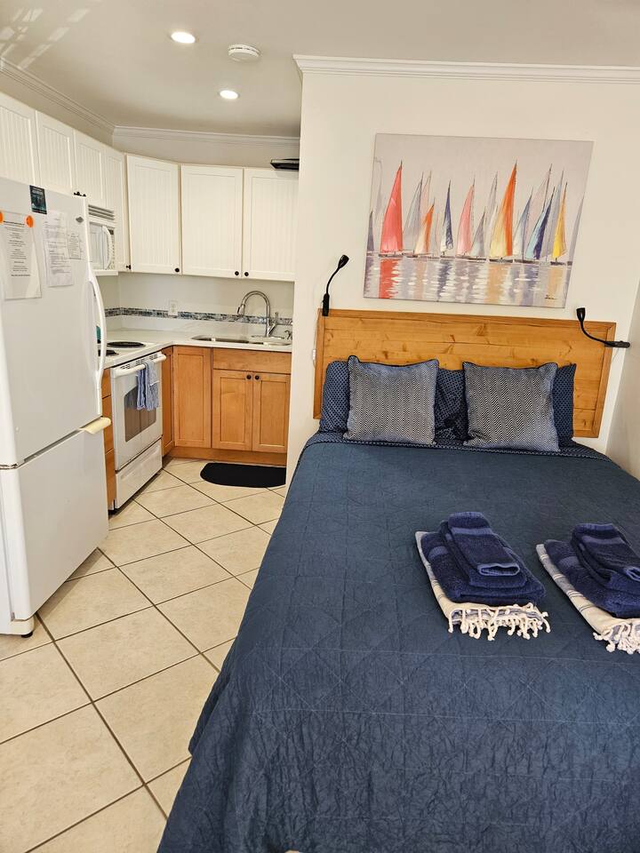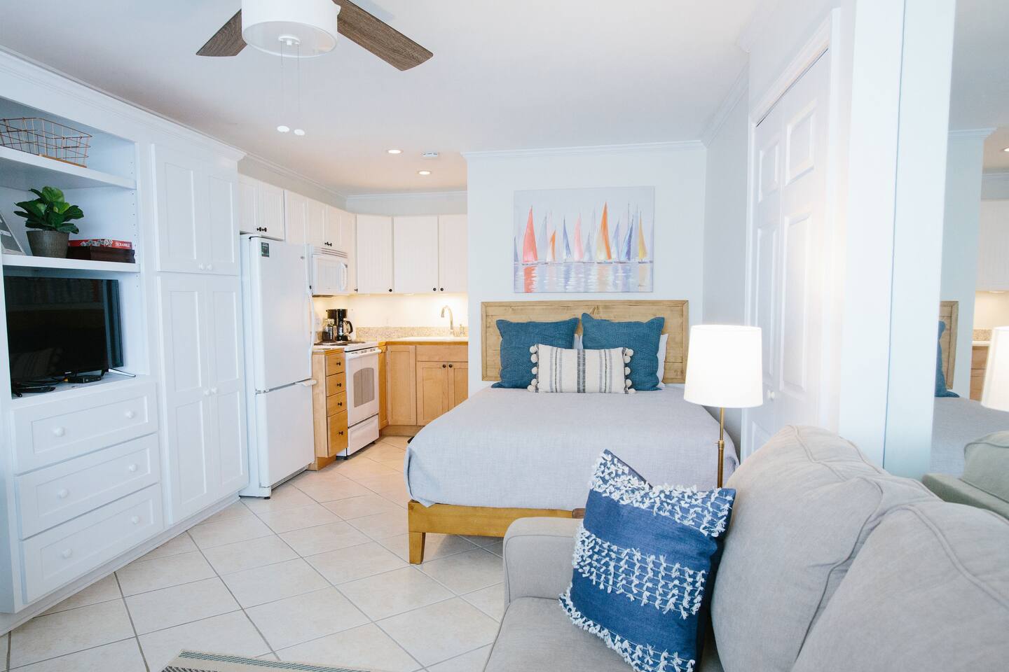 This beautiful studio condo is seconds from the beach by a walkway and gazebo. Lovely living area with TV, sleep sofa, ocean view, fully-equipped kitchen, and an updated bathroom. On-site amenities include a laundry room, pool, grills and picnic tables, gazebos overlooking the ocean and private (to the condo community) beach access. Work from here with private wifi access.