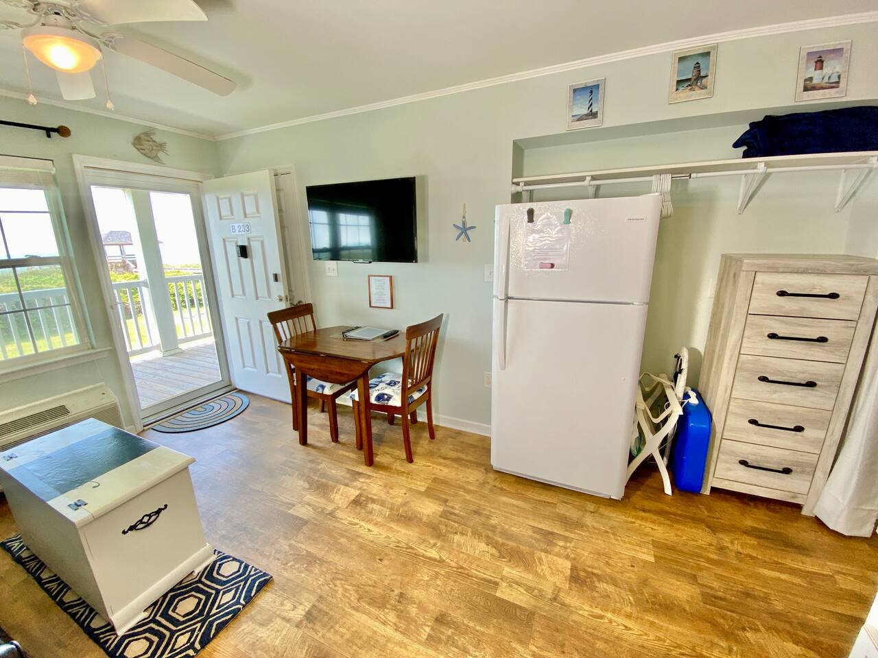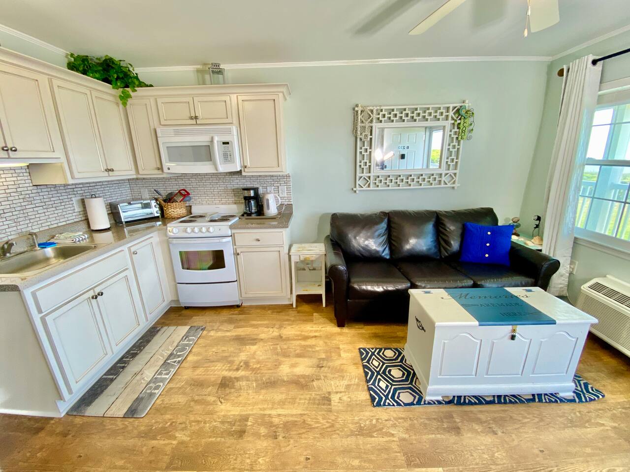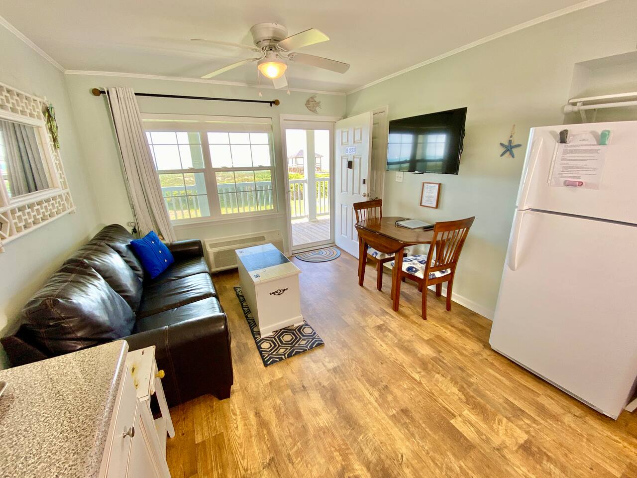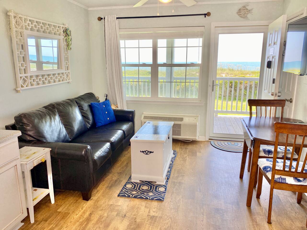 Come enjoy our studio condo haven by the sea! Well-appointed kitchen and a full bath. No elevator to the second floor. Very comfortable queen-size bed, plus a sofa for additional sleeping space. While it can accommodate up to three people, the condo may be a bit tight for three adults and the third person is sleeping on a sofa. A maximum of two adults is recommended. Two adults with one child is OK for this space. The absolute maximum number allowed is four people, including infants. Coffee, teas, linens, towels, and beach towels provided for your convenience. Recently remodeled, so you can relax with high-speed internet, cable TV, along with an easy beach side life. Great place to stay for that quiet vacation getaway to the coast! We ask guests to pick up after themselves and straighten up prior to departure. The cleaning fee is primarily for clean linens and deep cleaning, sanitizing, and laundering the linens between guests to make the unit as safe as possible for every stay. This condo has an amazing full view of the ocean, and you are mere steps away to be in the sand! Note: This home is in Eastern North Carolina, near the water. While we have regular pest control visits, you may still encounter a bug or two. The home is professionally cleaned between every guest and bugs just sometimes appear in this region. You'll find your stay to be easy, with access to all that you need for a nice relaxing get away (or quiet workspace with high-speed internet). A door code will be emailed to you when you book for easy entrance on your schedule (any time after 3 pm on the day you book). Full instructions, info, and a parking pass are provided in a guest book in the living room area. Enjoy! Boats, boat trailers, RVs and other similar oversized vehicles are not allowed at this complex.
