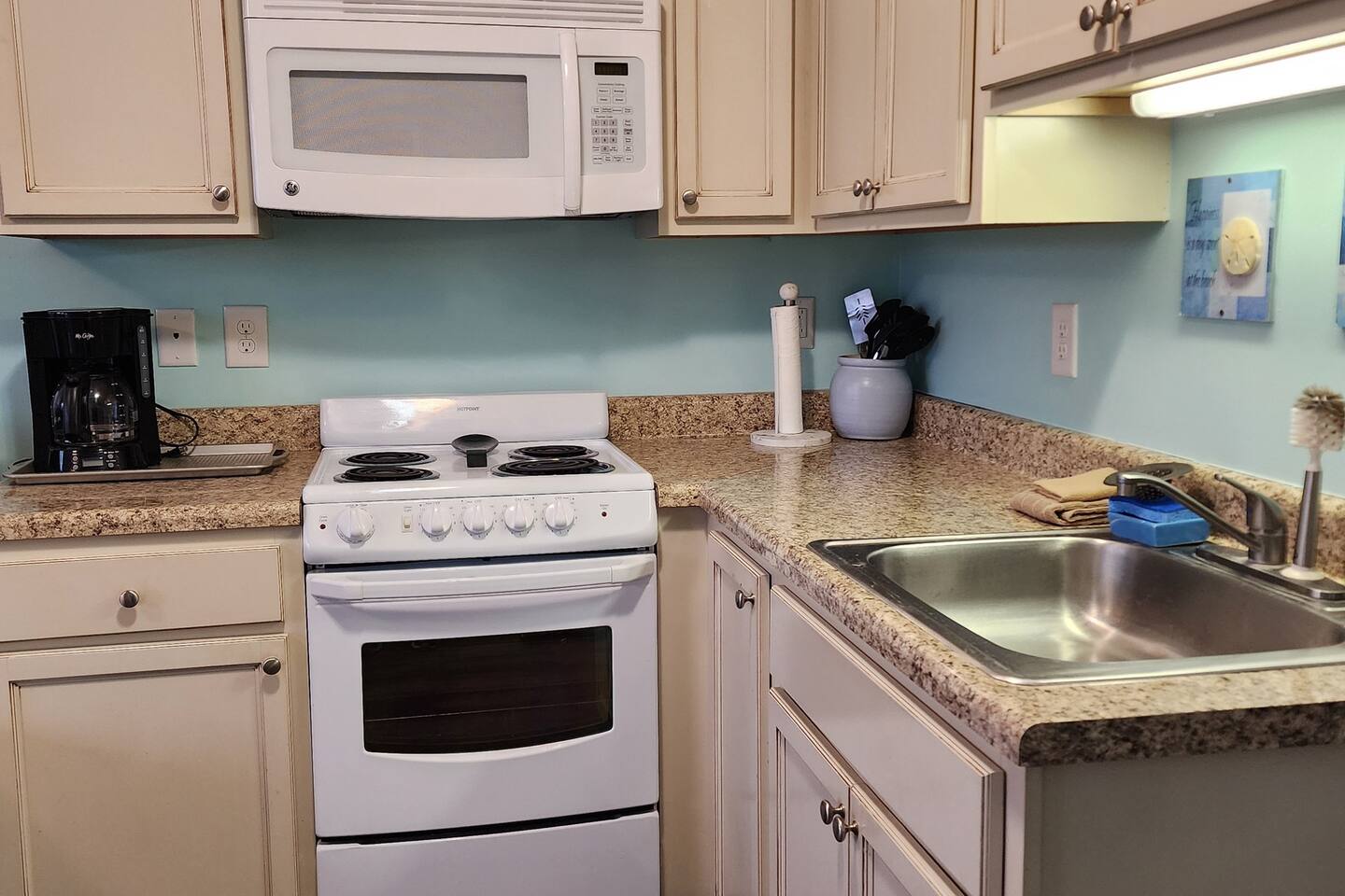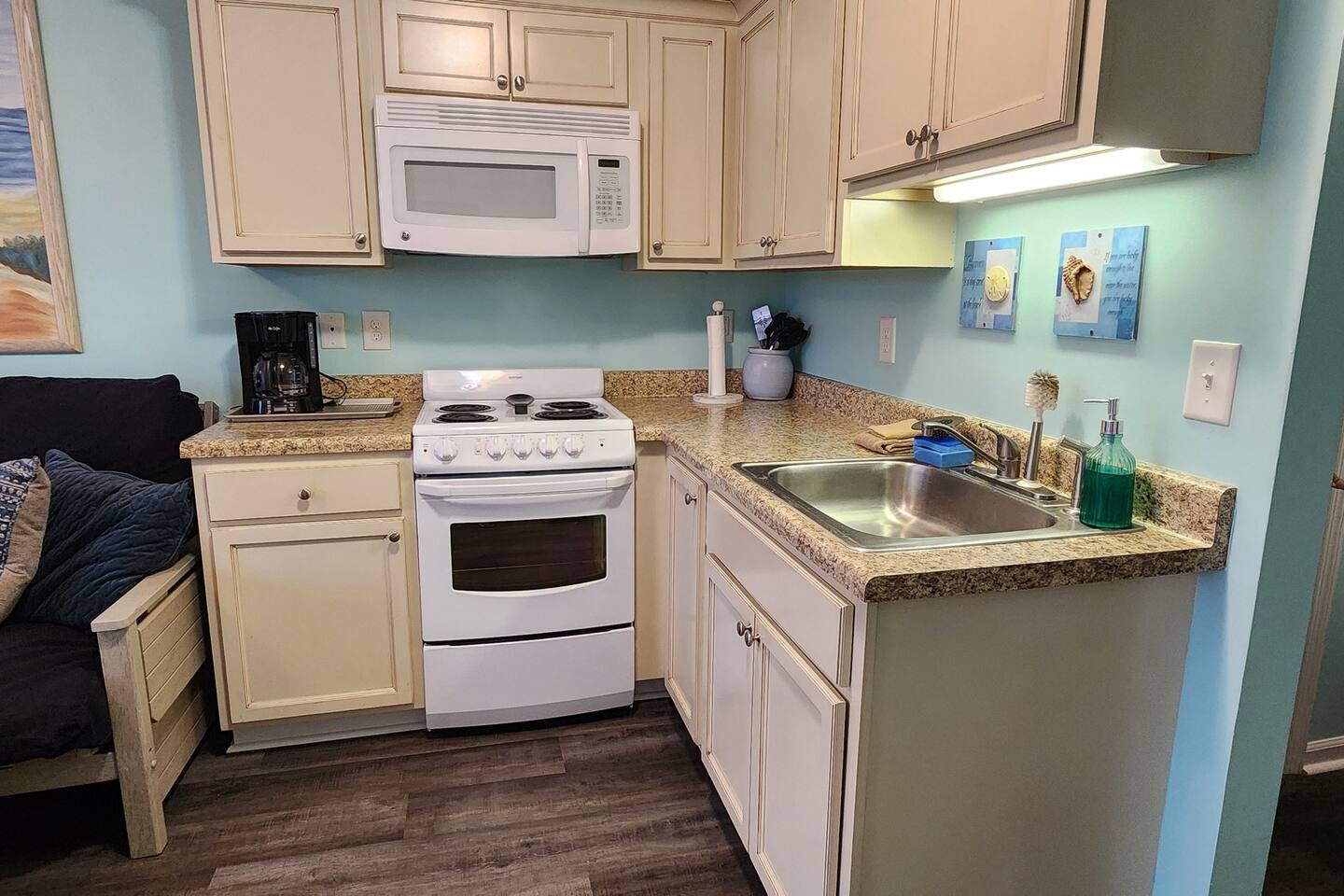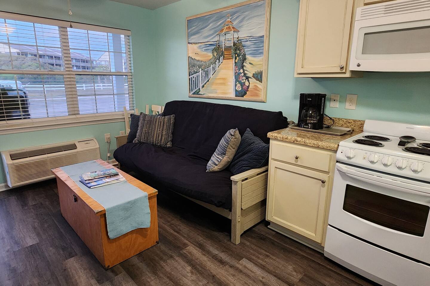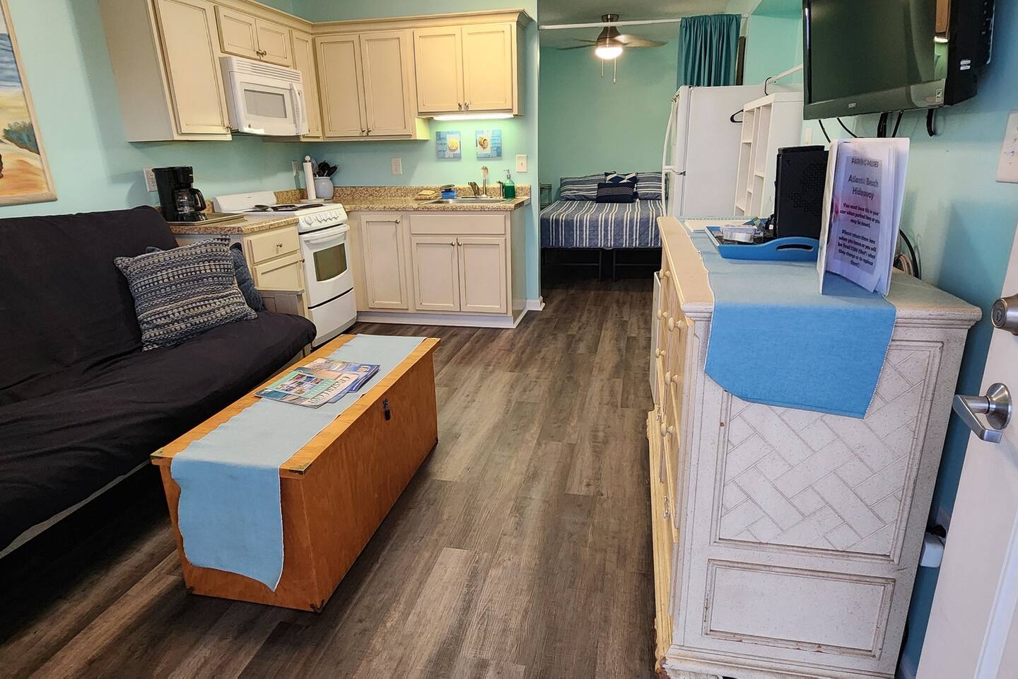 Step into your coastal oasis! Enjoy a well-appointed kitchen, a full bath, and the comfort of a queen-size bed, and a queen futon. It's coziest for up to three adults or two adults with two children. We've got you covered with coffee, teas, linens, and towels. Revel in high-speed internet and cable TV for a relaxing beachside life. While the unit doesn't boast an ocean view, the beach is just steps away! Book now for a memorable seaside escape. Make our studio condo your home away from home.