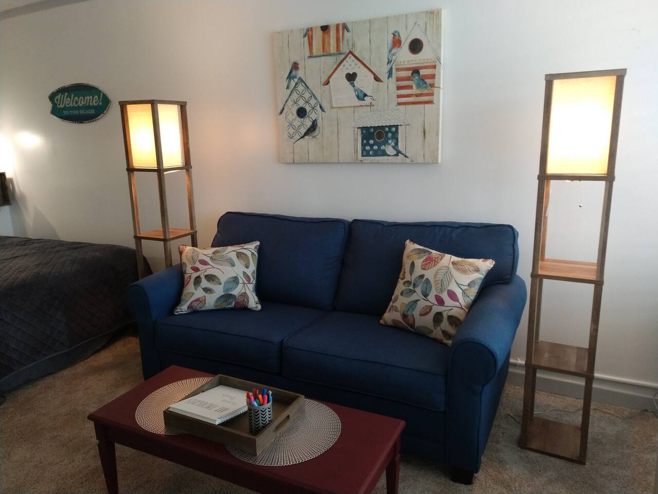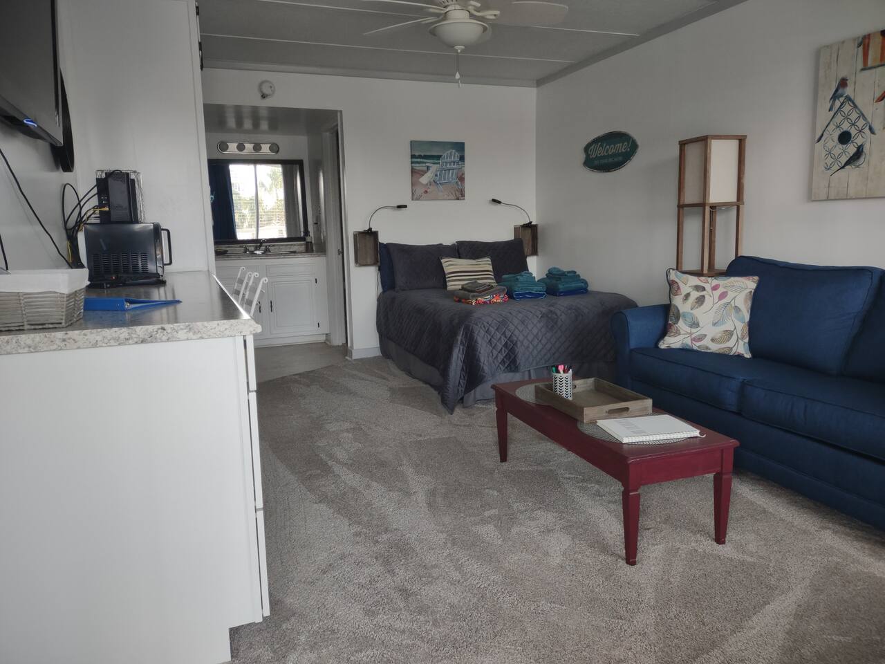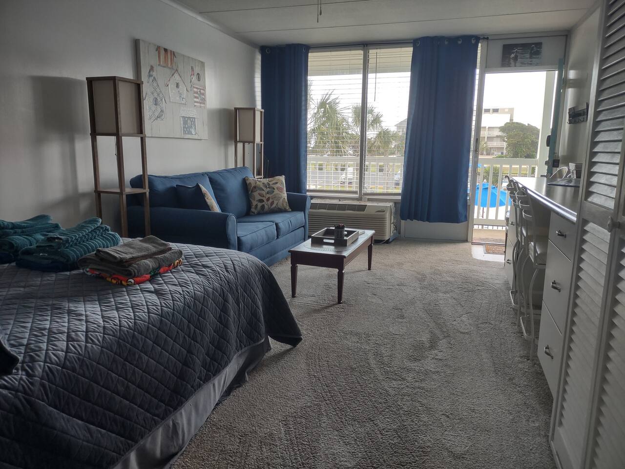 OFFERING MONTHLY SPECIALS FROM OCTOBER-MARCH, BASED ON LENGTH OF STAY. REACH OUT FOR PRICING. Sound side cute, clean & comfortable second floor condo, with access to a delightful beach, only a 3 minute walk away, right across the street via an easy public access. Includes a pool, outdoor grills, space for kids to run around, and free parking. Walking distance to a couple restaurants/shops and close to all Atlantic Beach, Emerald Isle, Morehead City, and Beaufort have to offer. Come enjoy your stay at the Southern Outer Banks! Well appointed kitchen and a full bath. Very comfortable full-size bed, plus a sleeper sofa for additional sleeping space. While it can accommodate up to four people, the condo may be a bit tight for four adults. A maximum of three adults is recommended. Two adults with two children is also OK for this space. Coffee, teas, linens, towels, and beach towels provided for your convenience. You can relax with high-speed internet, cable TV, along with an easy beach life. Great place to stay for that quiet vacation getaway to the coast! You'll have full private access to the entire studio condo, along with shared community amenities, such as the pool, the yards, the walk-to beach, gazebo, picnic tables, deck, and a great community on the island! We ask guests to leave no trace - pick up after themselves and straighten up prior to departure. The cleaning fee is for deep cleaning, sanitizing, and laundering the linens between guests to make the unit as safe as possible for every stay. Notes: We welcome nice, responsible humans of all races, ethnicities, origins, genders, orientations, and religions! This home is in Eastern North Carolina, near the water. While we have regular pest control visits, you may still encounter a bug or two. The home is professionally cleaned between every guest and bugs just sometimes appear in this region. The COA has security cameras on the exterior of the buildings that are on all the time. There are no recording devices or cameras inside the unit.