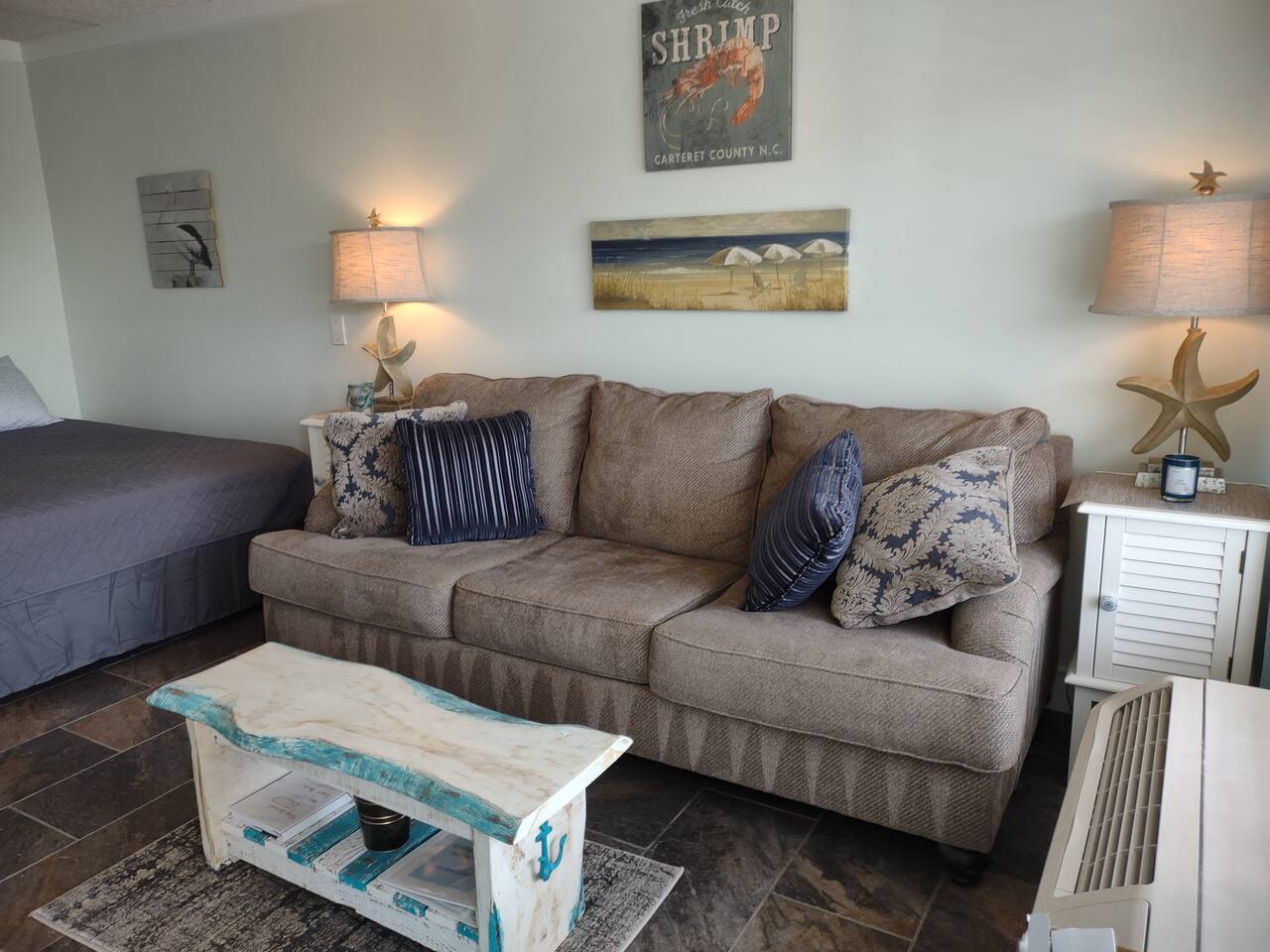 OFFERING MONTHLY SPECIALS FROM OCTOBER-MARCH, BASED ON LENGTH OF STAY. REACH OUT FOR PRICING. Sound side cute, clean & comfortable second floor condo, with access to a delightful beach, only a 3-minute walk away, right across the street via an easy public access. Includes a pool, outdoor grills, space for kids to run around, and free parking. Walking distance to a couple restaurants/shops and close to all Atlantic Beach, Emerald Isle, Morehead City, and Beaufort have to offer. Come enjoy your stay at the Southern Outer Banks! Well-appointed kitchen and a full bath. Very comfortable queen-size bed, plus a sleeper sofa for additional sleeping space. While it can accommodate up to four people, the condo may be a bit tight for four adults. A maximum of three adults is recommended. Two adults with two children are also OK for this space. Coffee, teas, linens, towels, and beach towels provided for your convenience. You can relax with high-speed internet, cable TV, along with an easy beach life. Great place to stay for that quiet vacation getaway to the coast! You'll have full private access to the entire studio condo, along with shared community amenities, such as the pool, the yards, the walk-to beach, gazebo, picnic tables, deck, and a great community on the island! Notes: We welcome nice, responsible humans of all races, ethnicities, origins, genders, orientations, and religions! This home is in Eastern North Carolina, near the water. While we have regular pest control visits, you may still encounter a bug or two. The home is professionally cleaned between every guest and bugs just sometimes appear in this region.