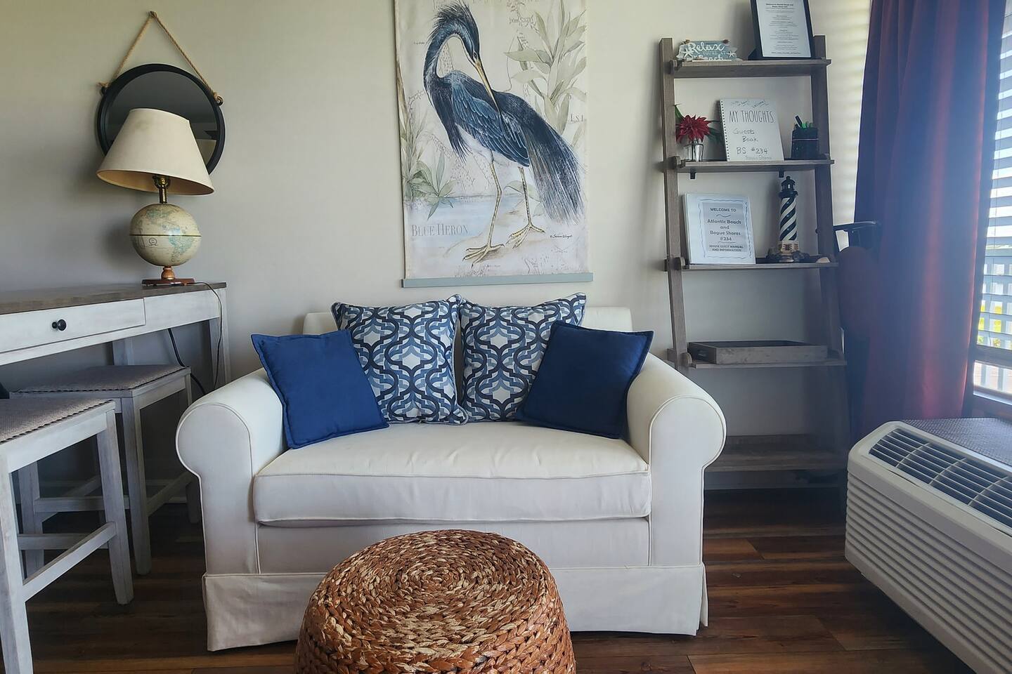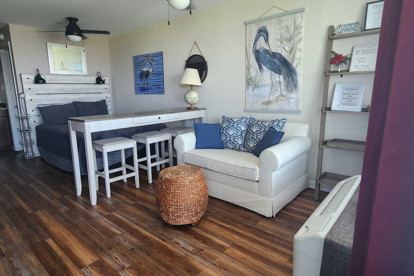 OFFERING MONTHLY SPECIALS FROM OCTOBER-MARCH, BASED ON LENGTH OF STAY. REACH OUT FOR PRICING. Sound facing contemporary, clean, & comfortable second floor condo, with access to a delightful beach, only a 3 minute walk away, right across the street via an easy public access. Includes a pool, outdoor grills, space for kids to run around, and free parking. Walking distance to a couple restaurants/shops and close to all Atlantic Beach, Emerald Isle, Morehead City, and Beaufort have to offer. Come enjoy your stay at the Southern Outer Banks! Well appointed kitchen and a full bath. Very comfortable queen-size bed, plus sitting area with view or TV, and a desk/table for dining. This condo is a great set-up for two or as an awesome remote working location. Did we mention the view? Incredible sound views from everywhere in the condo, and the set-up is designed specifically to maximize the view of the sound. Watch the boats and the birds. Coffee, teas, linens, towels, and beach towels provided for your convenience. You can relax with high-speed internet, cable TV, along with an easy beach life. Great place to stay for that quiet vacation getaway to the coast! You'll have full private access to the entire studio condo, along with shared community amenities, such as the pool, the yards, the walk-to beach, gazebo, picnic tables, deck, and a great community on the island! Notes: We welcome nice, responsible humans of all races, ethnicities, origins, genders, orientations, and religions! This home is in Eastern North Carolina, near the water. While we have regular pest control visits, you may still encounter a bug or two. The home is professionally cleaned between every guest and bugs just sometimes appear in this region.